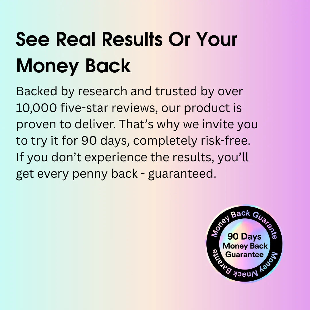 We’re confident you’ll love the results — but if not, you’re covered by our 90-day money-back guarantee. If you don’t see progress after consistent daily use, simply provide proof of use and we’ll refund your purchase.